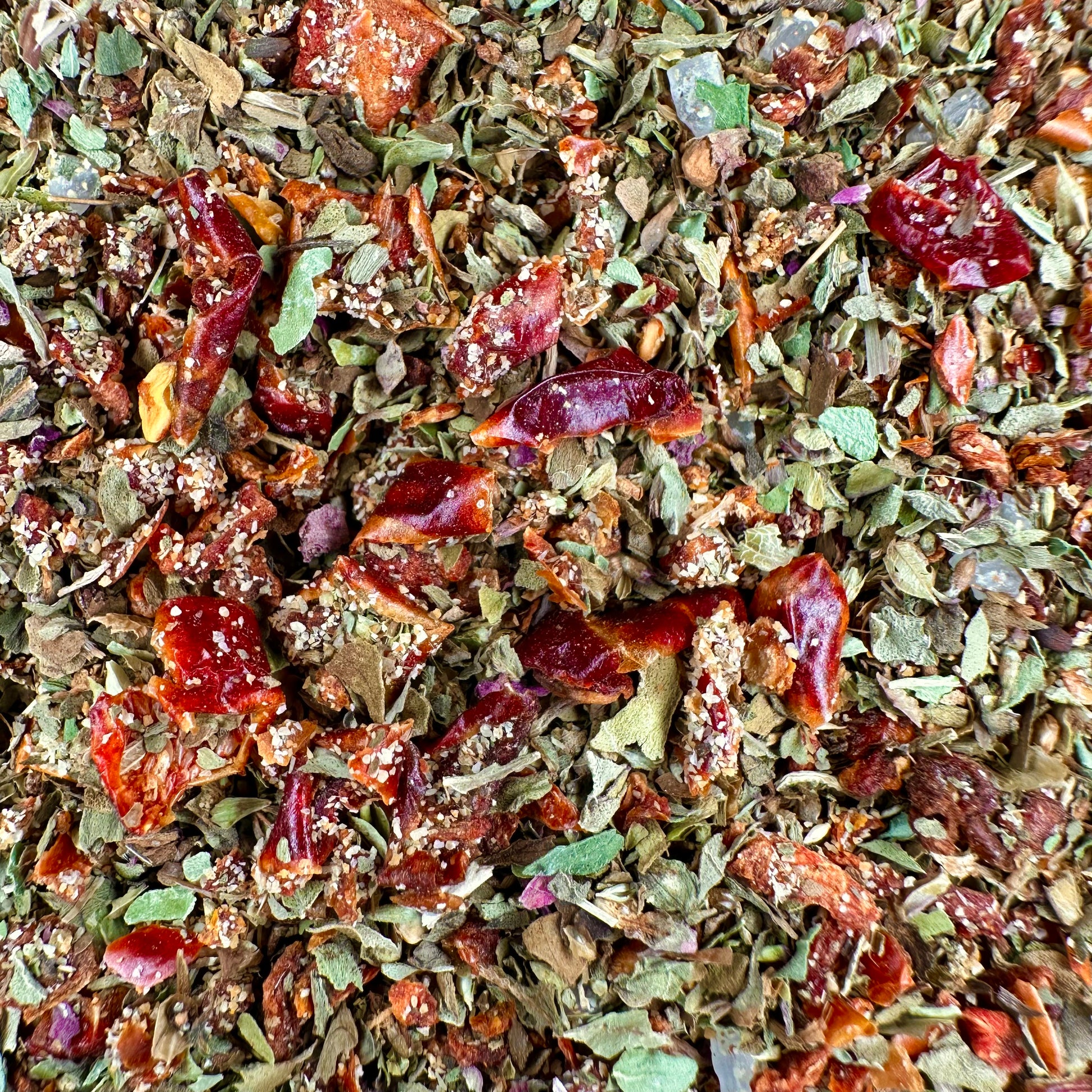 ZUTATEN: Meersalz, Tomatenflocken, Basilikum, Oregano, Paprikaflocken, Knoblauch.